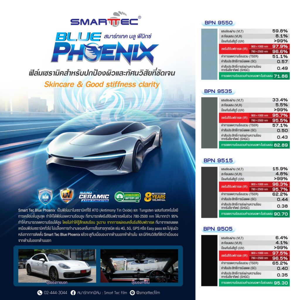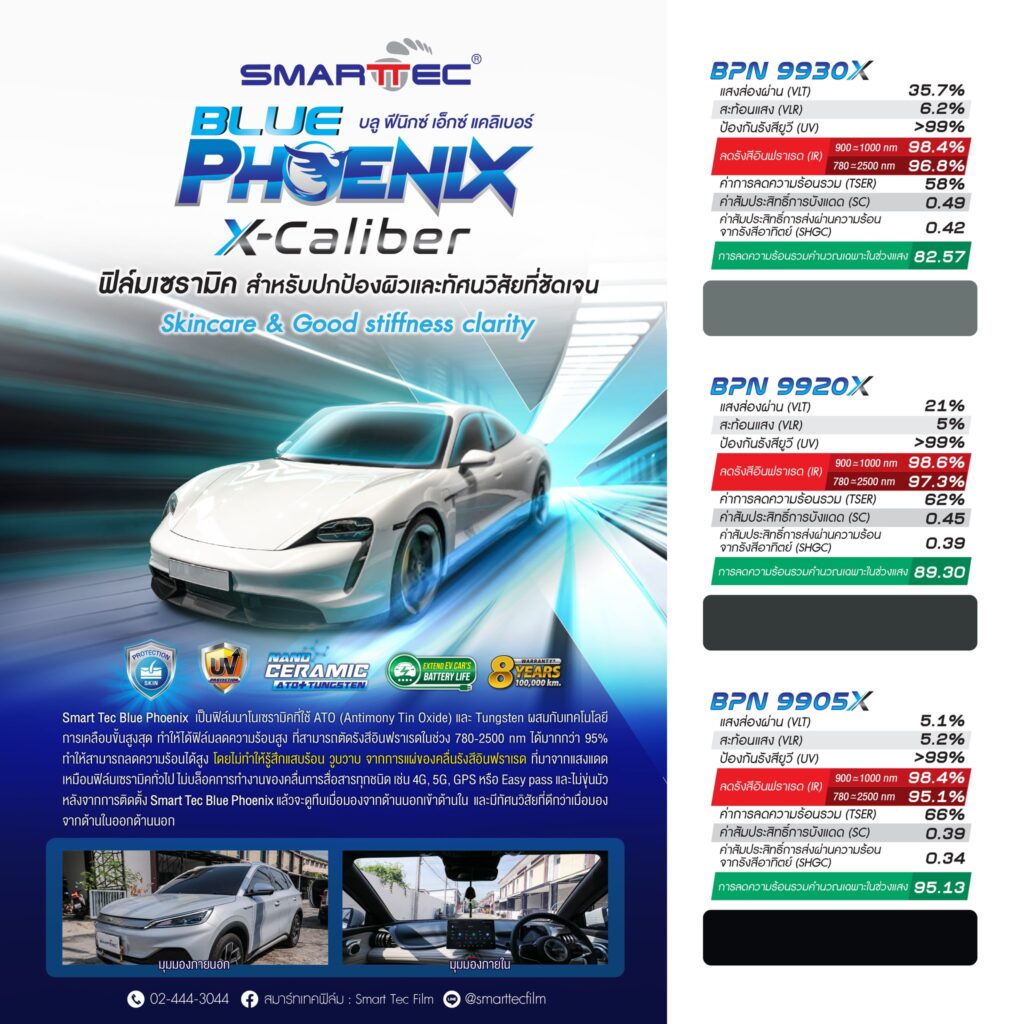 เป็นฟิล์มนาโนเซรามิคที่เสริมเพิ่มความเข้มข้นของ ATO (Antimony Tin Oxide) และ Tungsten เข้าไปมากกว่ารุ่นปกติ ทำให้ได้ฟิล์มลดความร้อนสูง ที่สามารถตัดรังสีอินฟราเรดในช่วง 780-2500 นาโนเมตร ได้มากกว่า 98% ทำให้สามารถลดความร้อนได้สูง โดยไม่ทำให้รู้สึกแสบร้อนวูบวาบ จากการแผ่ของคลื่นรังสีอินฟราเรด ที่มาจากแสงแดดเหมือนฟิล์มเซรามิคทั่วไปไม่บล็อคการทำงาน ของคลื่นการสื่อสารทุกชนิด เช่น 4G, 5G, GPS หรือ Easy pass และไม่ขุ่นมัวหลังจากการติดตั้ง Smart Tec Blue phoenix X-Caliber จะดูทึบเมื่อมองจากด้านนอกเข้าด้านใน และจะมองดูสว่าง สบายตาและมีทัศนวิสัยที่ดีกว่า เมื่อมองจากด้านในออกด้านนอก