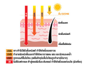 UVA เจาะเข้าไปได้ถึงชั้นหนังแท้ ทำให้เกิดริ้วรอยถาวร UVB ทำลายผิวหนังชั้นนอกทำให้เกิดอาการแดง แสบ และผิวหมองคล้ำ UVC ถูกกรองที่ชั้นโอโซน (แต่ในปัจจุบันชั้นโอโซนถูกทำลายไปมาก) IR รังสีอินฟราเรด เข้าสู่เซลล์ผิวในระดับเซลล์ ทำให้เกิดริ้วรอยก่อนวัย (ผิวเหี่ยว)
